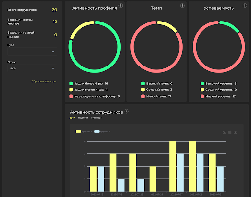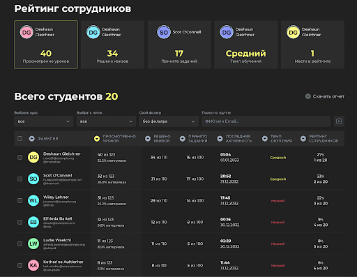 По каждому сотруднику представлена детальная информация: общее количество изученного материала, число завершенных практических заданий, отчеты в разрезе отдельных лекций.